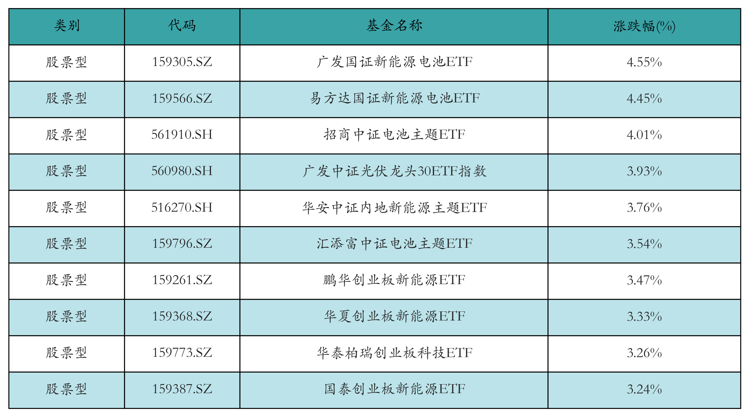 昨日股票型ETF涨幅最高的3只ETF及其收益率分别为:广发国证新能源电池ETF(4.55%)、易方达国证新能源电池ETF(4.45%)、招商中证电池主题ETF(4.01%)。涨幅前10详情见下表: