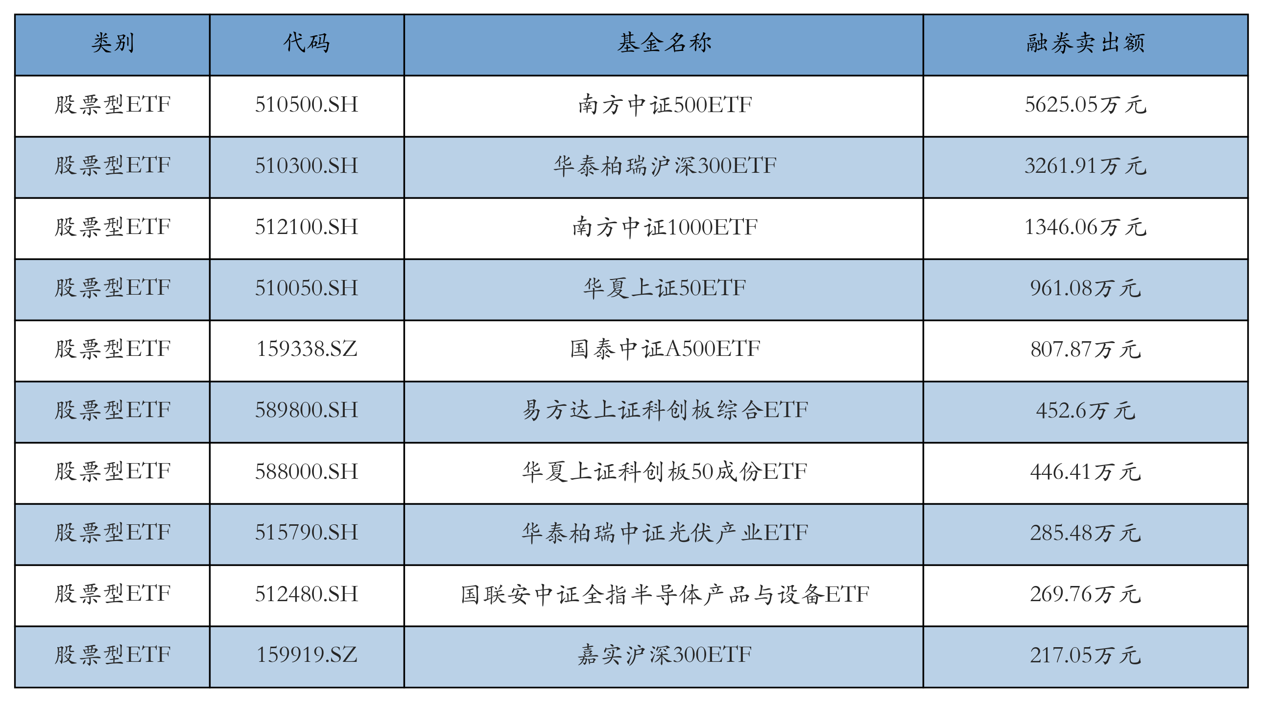 昨日股票型ETF融资卖出额最高的3只ETF及其卖出金额分别为:南方中证500ETF(5625.05万元)、华泰柏瑞沪深300ETF(3261.91万元)、南方中证1000ETF(1346.06万元)。融券卖出额前10详情见下表: