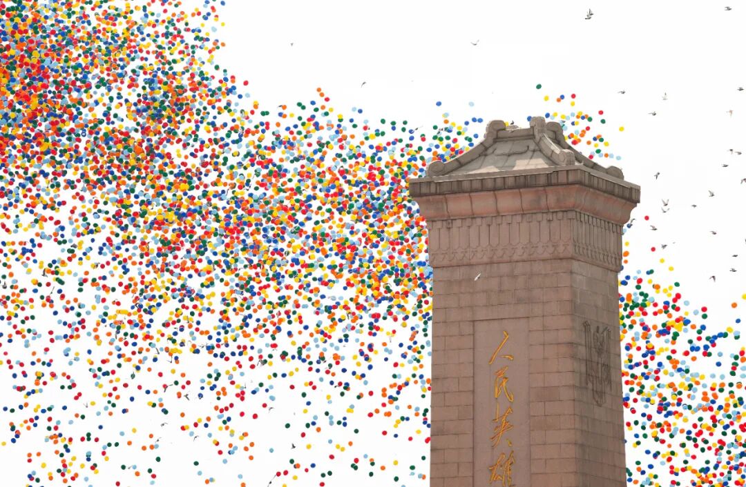 这是纪念大会现场放飞和平鸽和气球。新华社记者 邱少煜 摄
