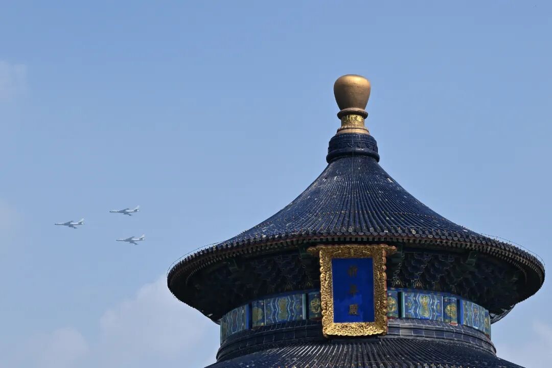 这是在北京天坛公园拍摄的轰炸机梯队。新华社记者 赵子硕 摄