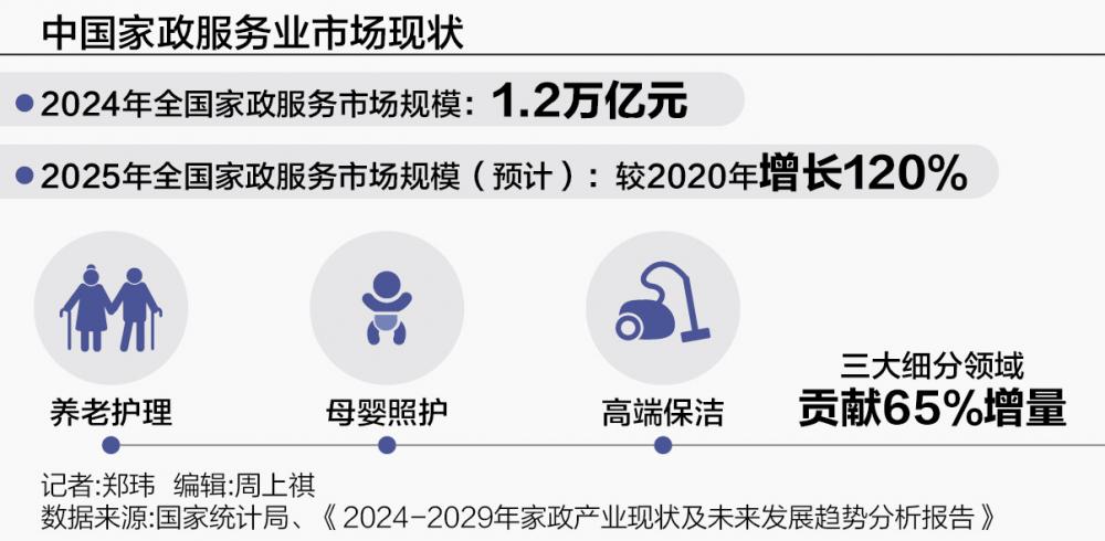 这是一个规模庞大的市场。国家统计局数据显示,2024年全国家政服务市场规模已突破1.2万亿元。《2024—2029年家政产业现状及未来发展趋势分析报告》显示,2025年中国家政服务业市场规模预计较2020年增长120%,其中养老护理、母婴照护、高端保洁三大细分领域贡献了65%的增量。