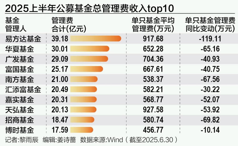 纵观公募机构的管理费收入格局,今年上半年收取管理费最多的前10家公募,其管理费总和占到了全市场的近四成。据2025中报,上半年总管理费收入前10名的公募管理人,分别是易方达基金、华夏基金、广发基金、富国基金、南方基金、汇添富基金、嘉实基金、天弘基金、招商基金和博时基金。