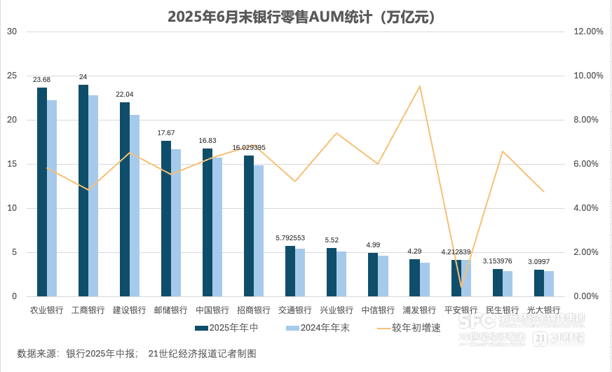 21世纪经济报道注意到,“零售AUM(管理零售客户总资产)”在中报季中被多家银行反复提及。这一指标被视为大财富管理的“基本盘”、部分银行口中“北极星”指标,是衡量银行零售综合能力的一个关键参考值。