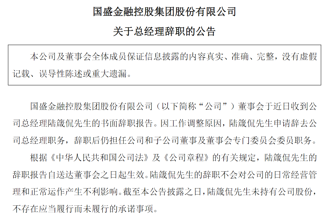 9月4日,国盛金控公告称,公司董事会于近日收到总经理陆箴侃的书面辞职报告。因工作调整原因,陆箴侃申请辞去公司总经理职务,辞职后仍担任公司和子公司董事及董事会专门委员会委员职务。根据有关规定,陆箴侃的辞职报告自送达董事会之日起生效。