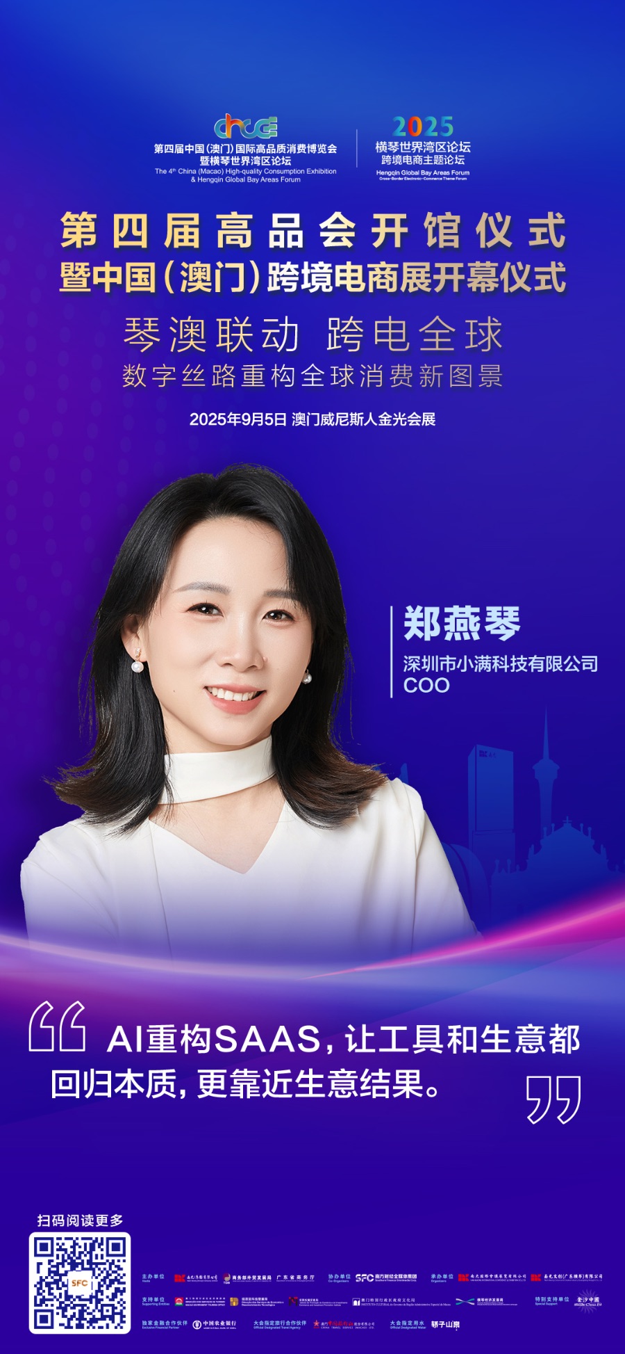 9月5日,高品会开馆仪式暨中国(澳门)跨境电商展开幕仪式在澳门举行。会上,深圳市小满科技有限公司COO郑燕琴在以“数字丝路重构全球消费新图景”为主题的圆桌对话上分享,“AI的本质是帮助商家回归到生意的本质。”