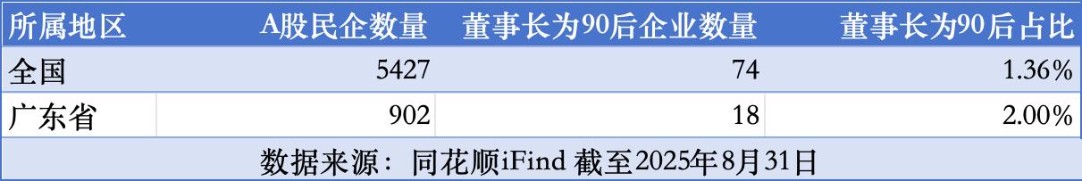同花顺 iFind 数据显示,截至 8 月31日,A 股民营企业中已有90后担任董事长的企业共74家,另有 1 家企业董事长为 00 后。年轻一代企业家已逐步崭露头角。