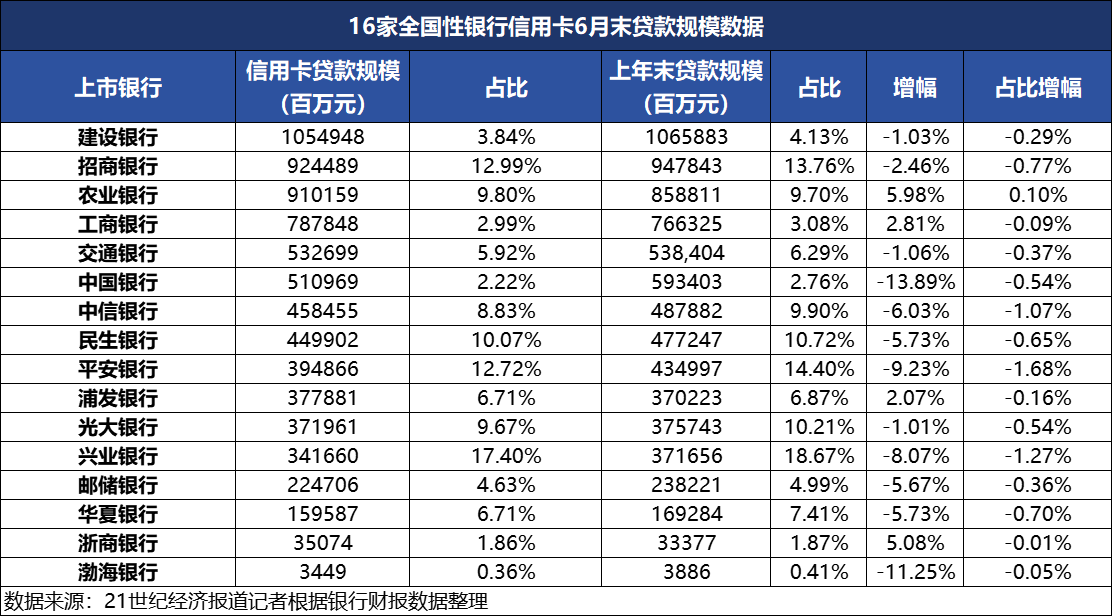 21世纪经济报道记者梳理了包括6家国有大行、10家股份制银行共16家全国性银行半年报数据发现,整体来看,16家银行在信用卡贷款规模、累计发卡量、交易金额等方面依然呈现下滑趋势,但与去年同期相比,也有积极信号出现。