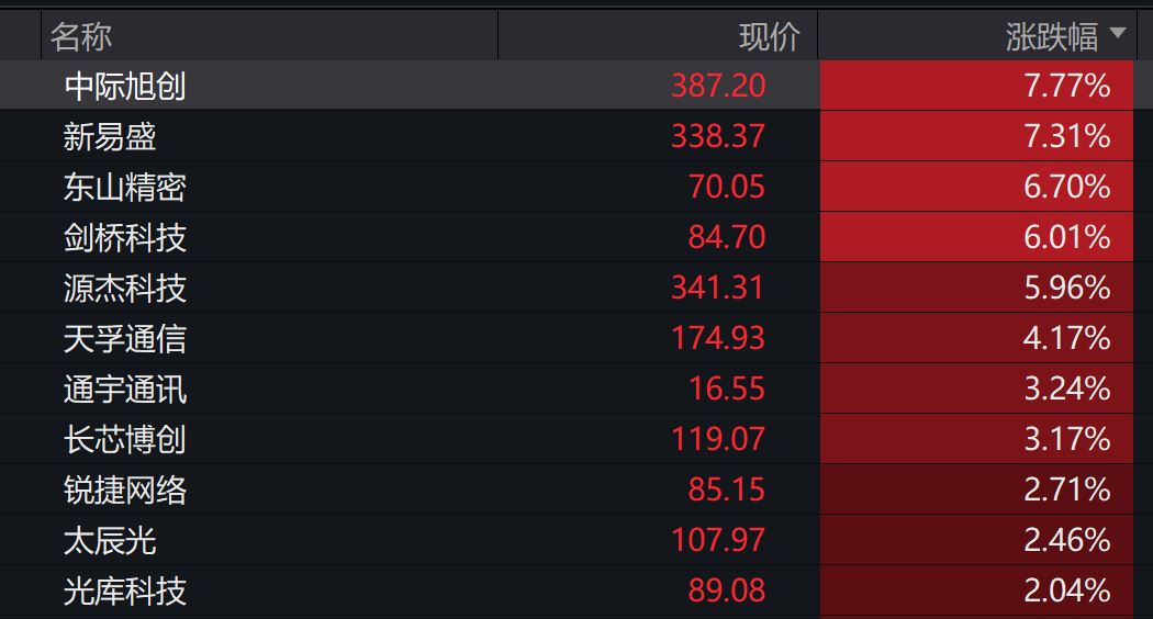 CPO、算力、PCB概念涨幅居前。中际旭创、新易盛双双高开逾5%。截至午盘大港股份涨停,新恒汇、海光信息、澜起科技涨超5%,东微半导、德明利、芯导科技、寒武纪、紫光国微、通富微电等跟涨。