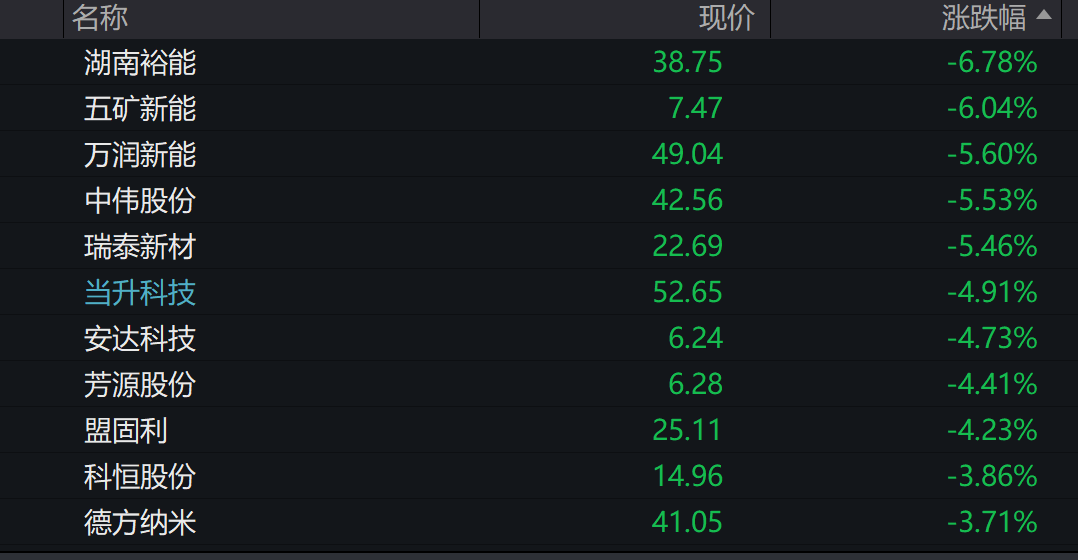 宁德时代枧下窝锂矿预计很快复产,锂电池产业链全线下挫;截至午盘,锂电电解液指数盘中跌幅扩大至2.47%,成分股普遍走低,其中天际股份跌4.82%、天赐材料跌4.46%、华盛锂电跌3.98%、多氟多跌3.35%、当升科技跌3.20%。