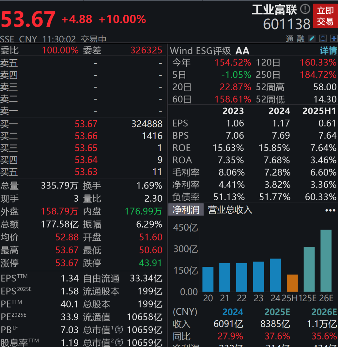 盘初,工业富联冲击涨停,报53.67元/股,成交金额114亿元,公司最新市值1.07万亿元。受益于AI业务强势增长,工业富联上半年实现营业收入3608亿元,同比增长35.6%;净利润121.1亿元,同比增长38.6%,均创同期历史新高。