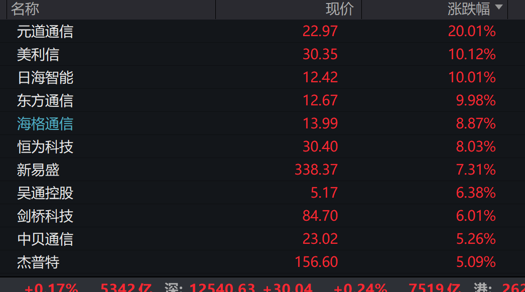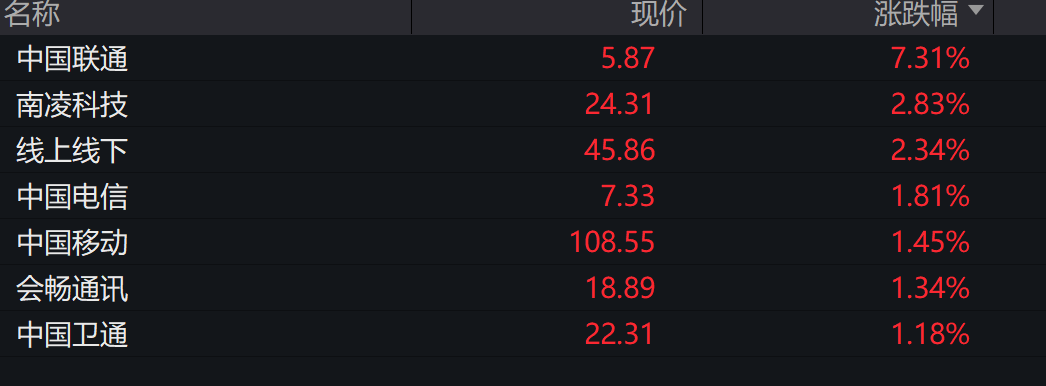 东方通信涨停,海格通信大涨8%,中国联通涨超7%,三维通信、中国卫星、航天宏图、华力创通等跟涨。