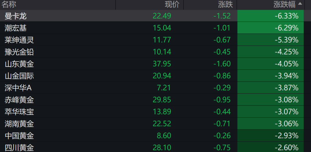 A股黄金股走低,曼卡龙、潮宏基、莱绅通灵跌超5%,西部黄金、山东黄金跟跌,港股黄金股也开始回调,其中,山东黄金、潼关黄金、中国白银集团跌超3%,招金矿业、灵宝黄金、赤峰黄金皆跌超1%。