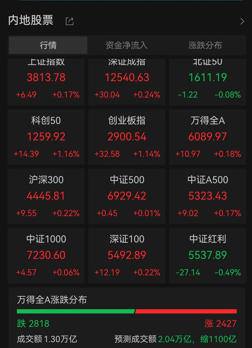 9月10日,A股三大指数早盘集体上涨,截至午盘,沪指涨0.17%报3813.78点,深成指涨0.24%,创业板指涨1.14%,北证50指数跌0.08%。沪深京三市半日成交额13028亿元,较上日缩量365亿元,全市场超2400只个股上涨。