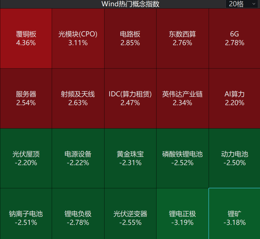 盘面上,覆铜板、CPO、AI算力等涨幅居前,锂矿、锂电等跌幅居前。