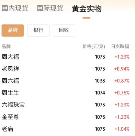 品牌黄金则呈现普遍上涨。9月10日,周大福、六福珠宝、金至尊等品牌金饰价突破1070元/克。