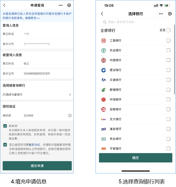 (2)查询人输入已故人员姓名、身份证号码、查询授权码等信息并选择查询银行(建议全选)后点击提交申请。