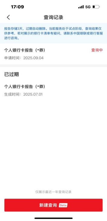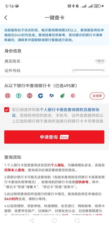 如用户仅需查询自身所有的银行卡,可直接在云闪付APP进入“一键查卡”小程序。在完成短信验证和人脸识别后,可点击“申请查询”,报告会在24小时内生成。报告在云闪付APP上保存3天。