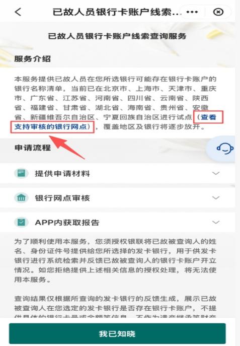 登录云闪付APP,搜索“已故人员银行卡账户线索查询”小程序,点击“查看支持审核的银行网点”,可查阅到目前提供已故人员查卡服务的银行网点信息。