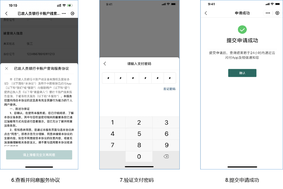 (1)查询人登录云闪付APP,进入“已故人员银行卡账户线索查询”小程序,点击“我已知晓”后进入申请查询页面。