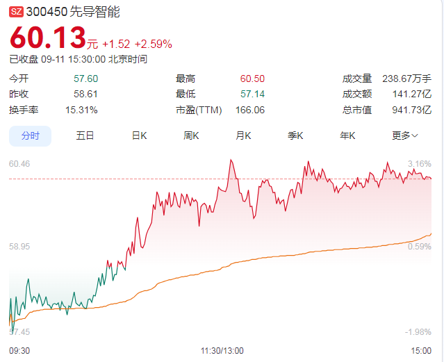 9月11日盘中,先导智能股价再度攀升,创下历史新高。截至收盘,该股报60.13元,成交金额为141.27亿元,总市值为941.73亿元。据统计,自8月28日以来,先导智能累计上涨107.20%,表现非常亮眼。