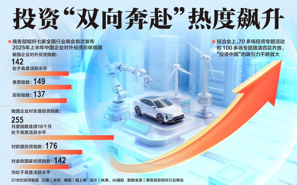 数据显示,1~6月,我国企业对外投资指数为142,处于高度活跃水平。其中,意愿指数为149,高度活跃;实际指数为137,较高活跃。