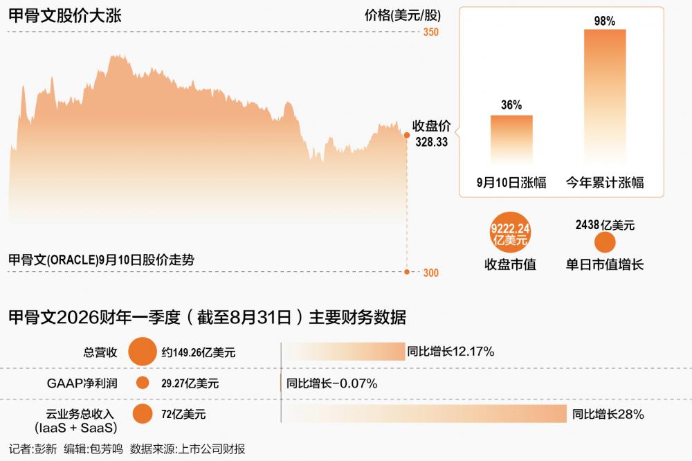 截至美国当地时间9月10日收盘,甲骨文股价报328.33美元/股,单日涨幅达36%,盘中一度触及345.46美元/股的历史高位,市值逼近“万亿美元俱乐部”。