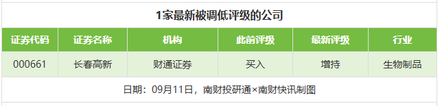 评级调低方面,9月11日,财通证券对长春高新的评级从“买入”调低至“增持”。
