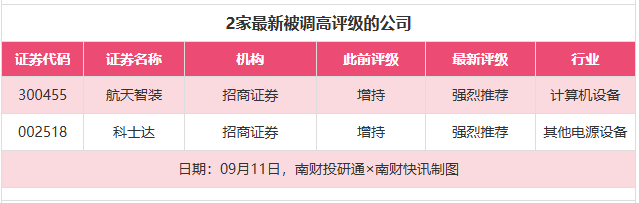 评级调高方面,9月11日,招商证券对航天智装、科士达的评级均从“增持”调高至“强烈推荐”。