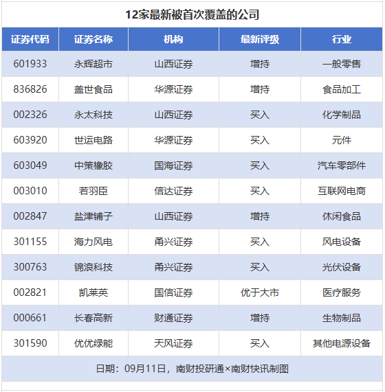 首次覆盖方面,9月11日券商共给出了12次首次覆盖,其中永辉超市、永太科技获得山西证券分别给予“增持”“买入”评级,盖世食品、世运电路获得华源证券分别给予“增持”“买入”评级,中策橡胶获得国海证券给予“买入”评级。