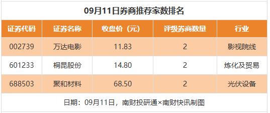 从券商推荐家数来看,9月11日有96家上市公司得到券商推荐,其中万达电影、桐昆股份、聚和材料均获得2家推荐。