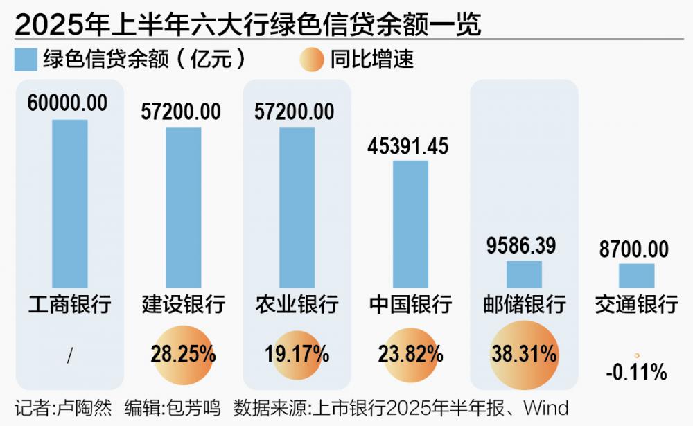 分机构类型看,国有六大行的“压舱石”作用尤为突出。六大行合计绿色贷款余额超20万亿元,占全部A股上市银行总量的近半数,其中工商银行以60000亿元的绿色信贷余额位居行业首位,建设银行、农业银行紧随其后,余额均达57200亿元,分别同比增长28.25%、19.17%;邮储银行则以38.31%的同比增速成为六大行中的“增速黑马”,绿色贷款余额达9586.39亿元,规模逼近万亿门槛;中国银行境内绿色信贷余额45391.45亿元,同比增长23.82%。