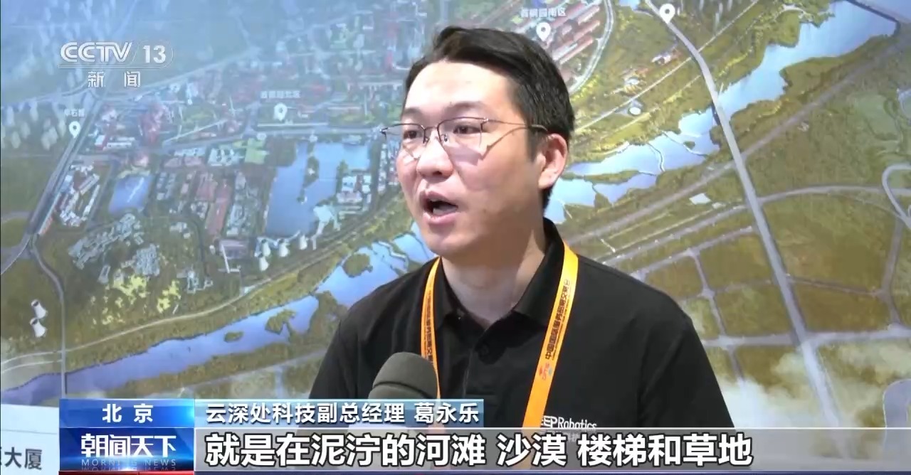 云深处科技副总经理 葛永乐:四足机器人其实最大的优势,就是在泥泞的河滩、沙漠、楼梯和草地都有很好的一个适应性,它可以替代人类不管是在室内还是室外,能够更好地去完成一些作业。