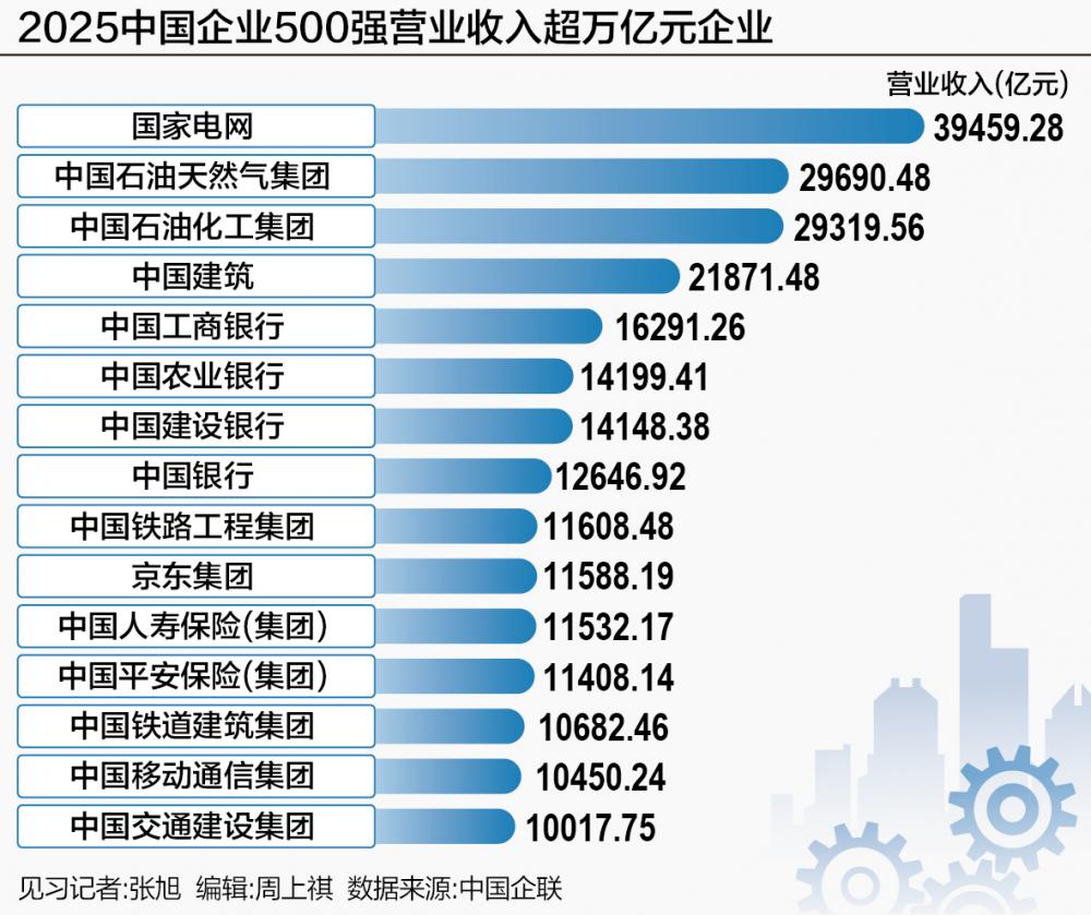 记者从发布会上了解到,2025中国企业500强入围门槛479.60亿元,较2024年提升5.79亿元。有15家营业收入超过万亿元,其中国家电网营业收入超过3万亿元,位居第一。