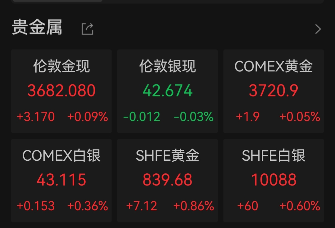 截至9月16日13:43,现货黄金报3682.08美元/盎司,涨0.09%;COMEX黄金期货报3720.9美元/盎司,涨0.05%。