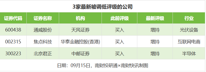 评级调低方面,9月15日,券商调低上市公司评级达到3家次,最新数据包括了天风证券对通威股份的评级从“买入”调低至“增持”,华泰金融控股(香港)对焦点科技的评级从“买入”调低至“增持”,中邮证券对北京君正的评级从“买入”调低至“增持”。