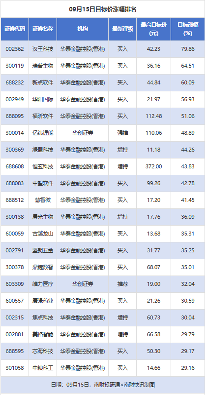南财投研通数据显示,9月15日,券商给予上市公司目标价共53次,按最新收盘价计算,目标价涨幅排名居前的公司有汉王科技、瑞普生物、新点软件,目标价涨幅分别为79.86%、64.51%、60.09%,分别属于软件开发、动物保健、软件开发行业。