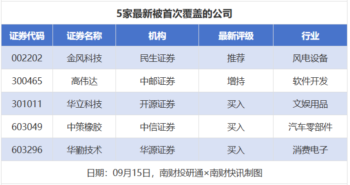 首次覆盖方面,9月15日券商共给出了5次首次覆盖,其中金风科技获得民生证券给予“推荐”评级,高伟达获得中邮证券给予“增持”评级,华立科技获得开源证券给予“买入”评级,中策橡胶获得中信证券给予“买入”评级,华勤技术获得华源证券给予“买入”评级。