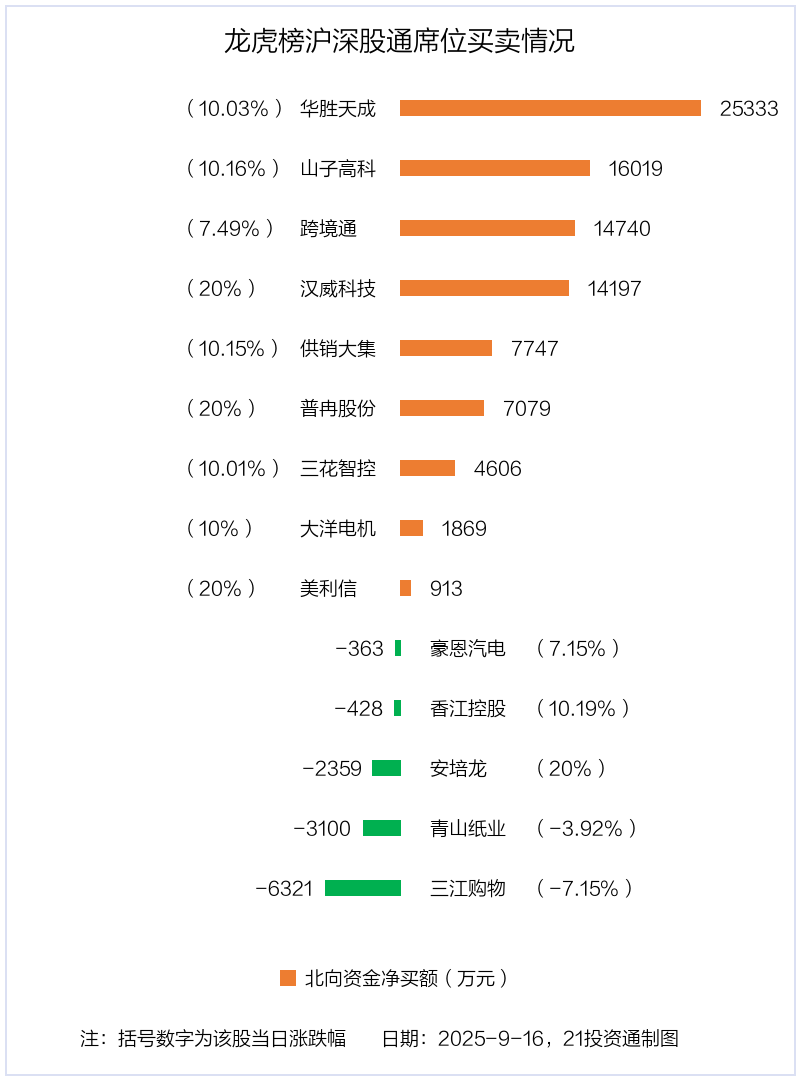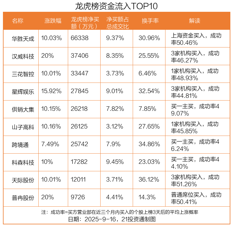 9月16日,上证指数上涨0.04%,深证成指上涨0.45%,创业板指上涨0.68%。盘后龙虎榜数据显示,共有39只个股因当日异动登上龙虎榜,资金净流入最多的是华胜天成(600410.SH),达6.63亿元。