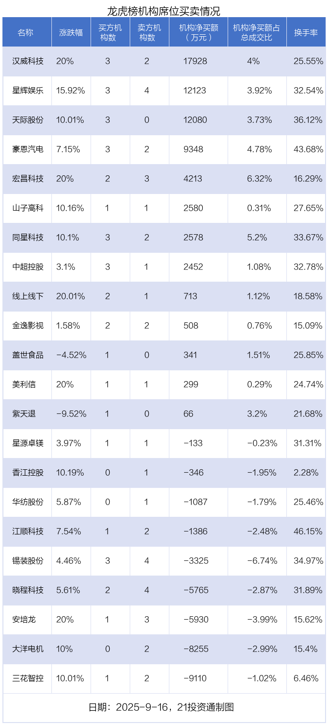 9月16日,22只个股龙虎榜出现了机构的身影,机构合计净买入2.99亿元。具体来看,机构净买入13股,净卖出9股。