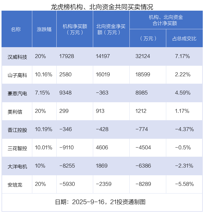 值得注意的是,机构和北向资金共同净买入了山子高科、汉威科技、美利信等3股;共同净卖出了香江控股、安培龙等2股;在三花智控,大洋电机,豪恩汽电上出现分歧,机构净卖出三花智控9110.32万元,北向资金净买入4605.93万元;机构净卖出大洋电机8255.17万元,北向资金净买入1869.27万元;机构净买入豪恩汽电9348.36万元,北向资金净卖出363.23万元。