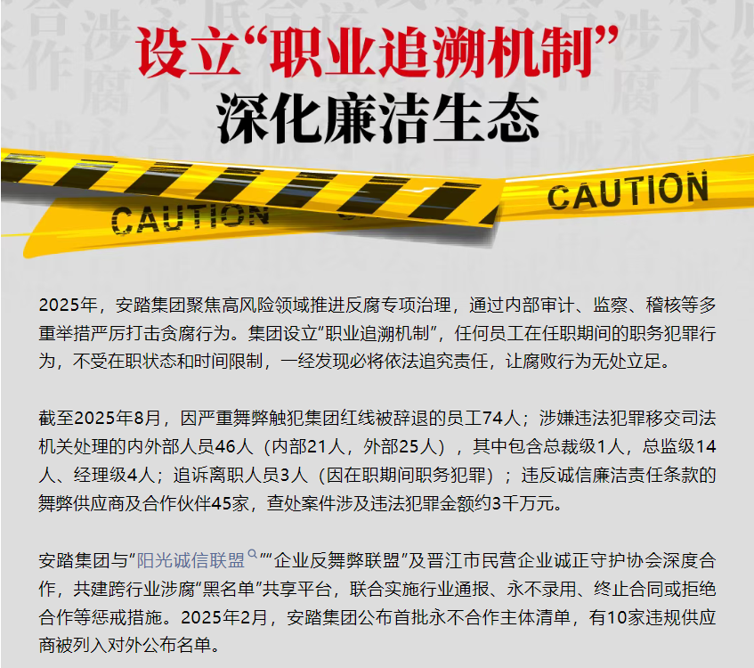 9月16日,据“廉洁安踏”微信公众号消息,2025年,安踏集团聚焦高风险领域推进反腐专项治理,通过内部审计、监察、稽核等多重举措严厉打击贪腐行为。截至2025年8月,因严重舞弊触犯集团红线被辞退的员工74人;涉嫌违法犯罪移交司法机关处理的内外部人员46人(内部21人,外部25人),其中包含总裁级1人,总监级14人、经理级4人;追诉离职人员3人(因在职期间职务犯罪);违反诚信廉洁责任条款的舞弊供应商及合作伙伴45家,查处案件涉及违法犯罪金额约3千万元。