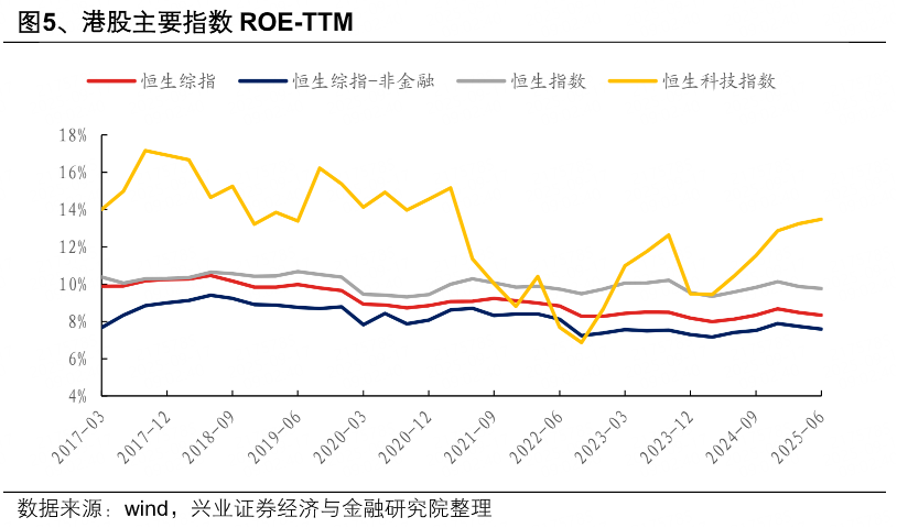 - 2025年二季度,恒生指数、恒生科技收入同比增速分别为2.45%、14.43%,净利润同比增速分别为-1.12%、16.18%。