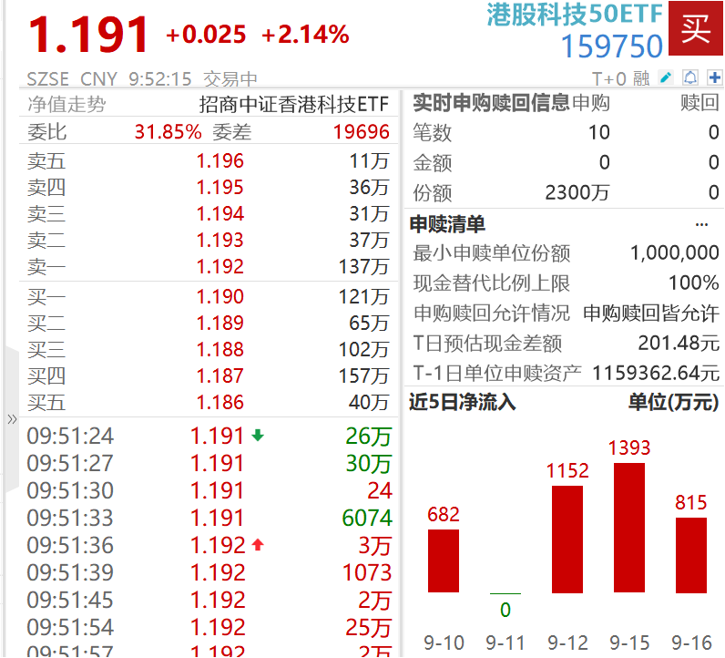 港股科技50ETF(159750)涨超2%,早盘成交超6000万元。行情数据显示,截至发稿,盘中实时获2300万份净申购,拉长时间线看,该ETF近5个交易日获资金净流入合计超4000万元。