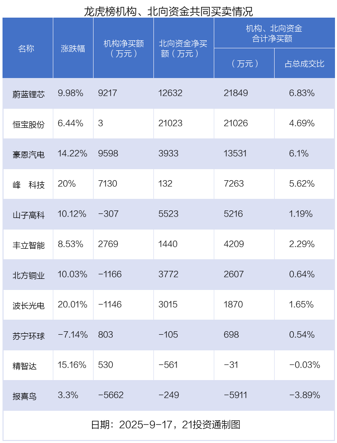 9月17日,21只个股龙虎榜出现了机构的身影,机构合计净买入2.08亿元。具体来看,机构净买入11股,净卖出10股。