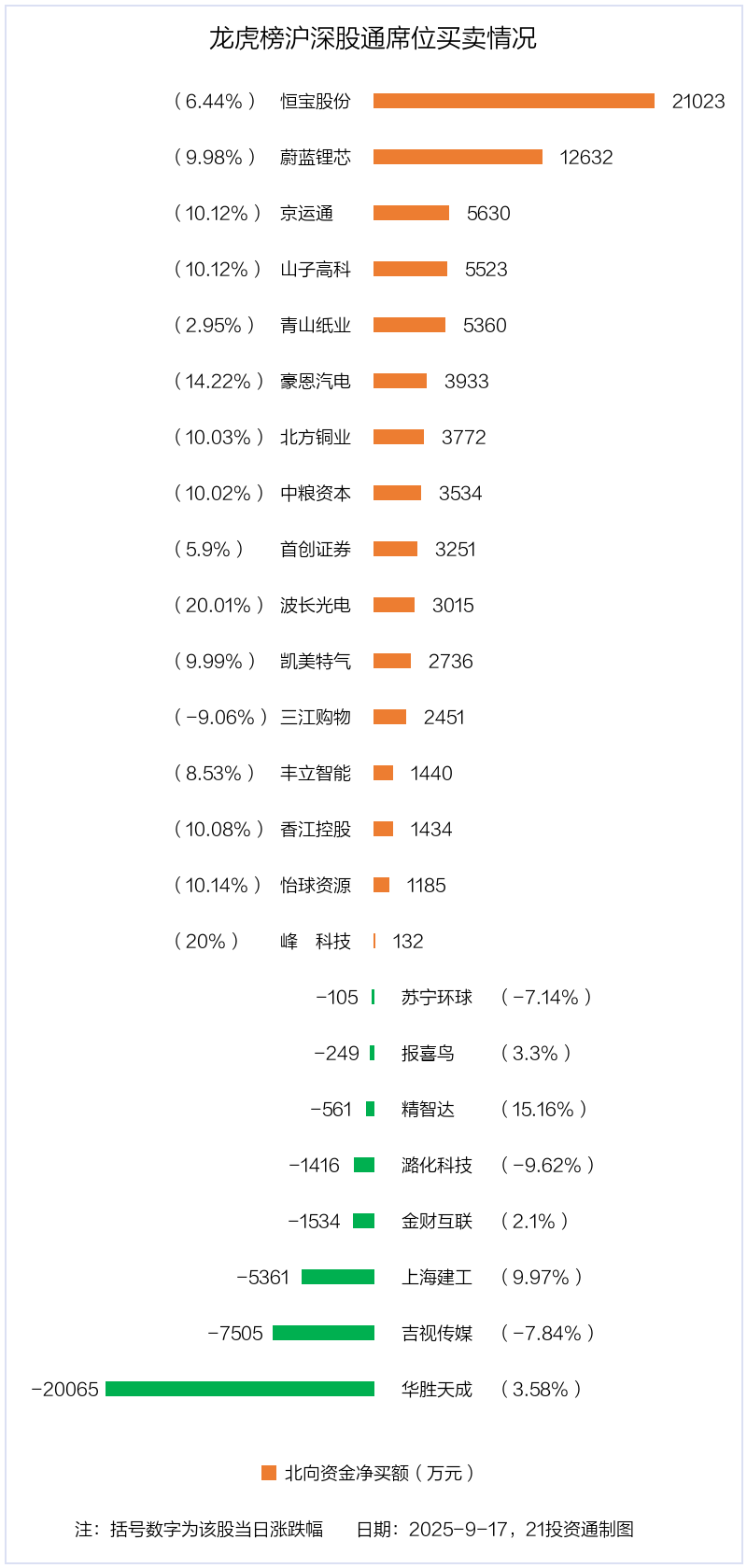 9月17日,北向资金参与龙虎榜中的个股共有24只,合计净买入4.03亿元。其中沪股通净买入7 股,净卖出5 股,合计净卖出1.55亿元;深股通净买入9 股,净卖出3 股,合计净买入5.57亿元。