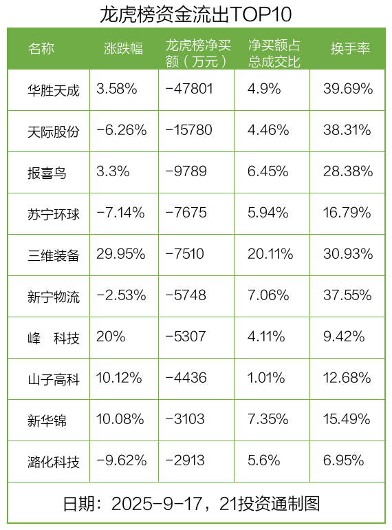 而龙虎榜中资金净流出最多的是华胜天成(600410.SH),被净卖出为4.78亿元,占总成交金额的4.9%。华胜天成收盘上涨3.58%,换手率为39.69%。