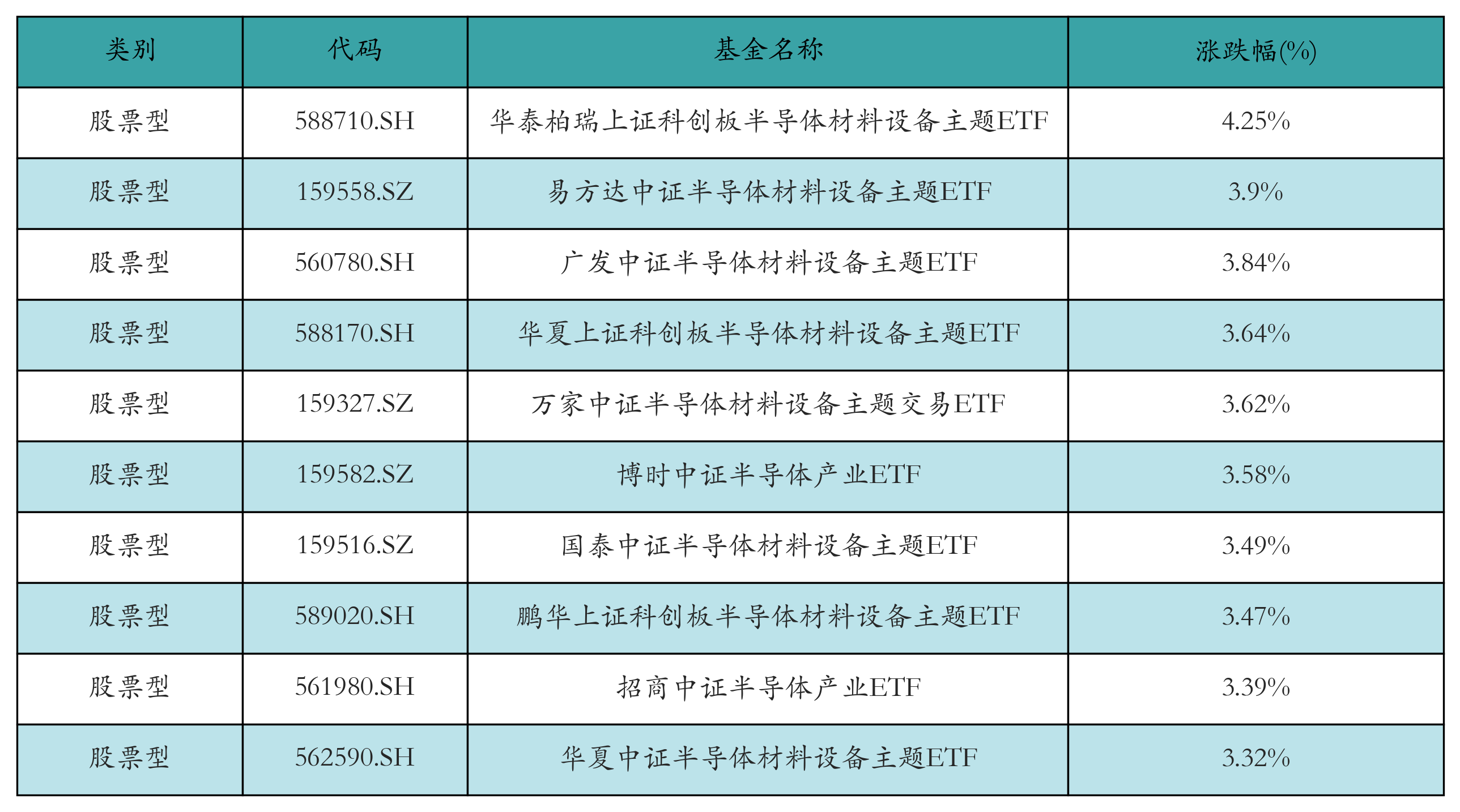 昨日股票型ETF涨幅最高的3只ETF及其收益率分别为:华泰柏瑞上证科创板半导体材料设备主题ETF(4.25%)、易方达中证半导体材料设备主题ETF(3.9%)、广发中证半导体材料设备主题ETF(3.84%)。涨幅前10详情见下表: