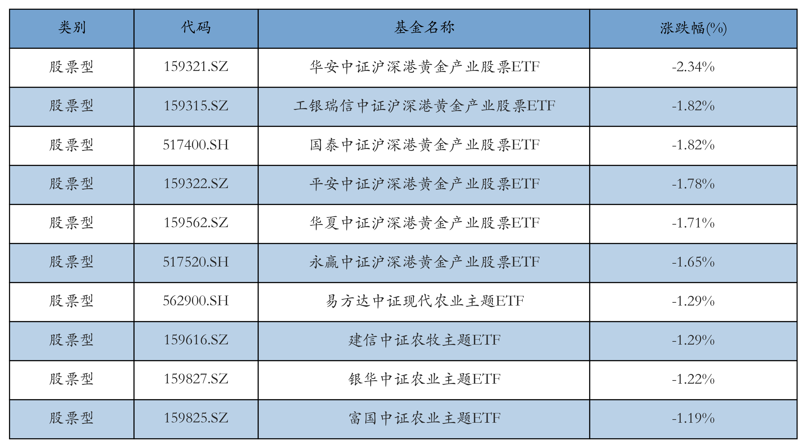 昨日股票型ETF跌幅最大的3只ETF及其收益率分别为:华安中证沪深港黄金产业股票ETF(-2.34%)、工银瑞信中证沪深港黄金产业股票ETF(-1.82%)、国泰中证沪深港黄金产业股票ETF(-1.82%)。跌幅前10详情见下表:
