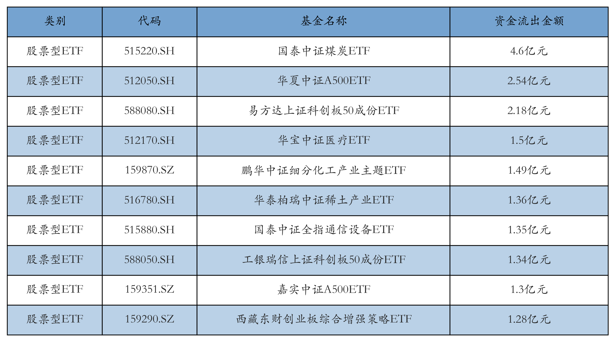 昨日股票型ETF资金流出最多的3只ETF及其流出金额分别为:国泰中证煤炭ETF(流出4.6亿元)、华夏中证A500ETF(流出2.54亿元)、易方达上证科创板50成份ETF(流出2.18亿元)。资金流出前10详情见下表: