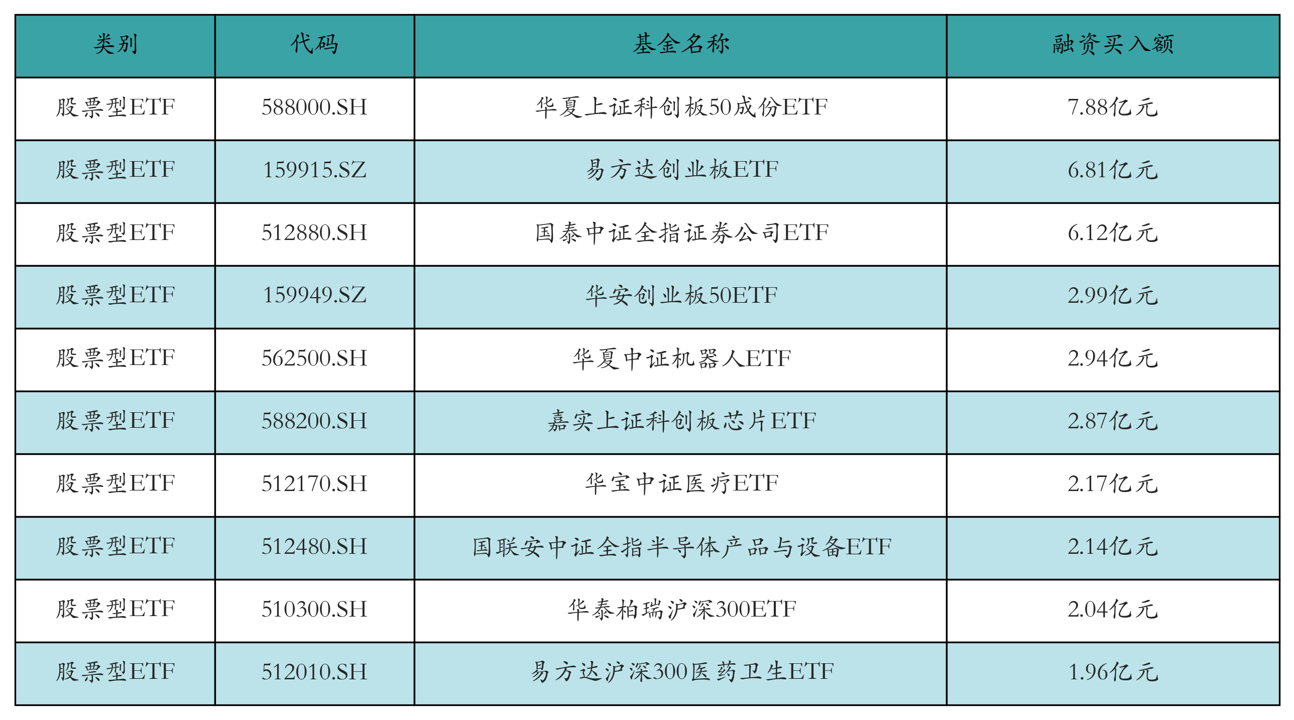 昨日股票型ETF融资买入额最高的3只ETF及其买入金额分别为:华夏上证科创板50成份ETF(7.88亿元)、易方达创业板ETF(6.81亿元)、国泰中证全指证券公司ETF(6.12亿元)。融资买入额前10详情见下表: